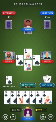 The game is played with 32 cards consisting of 8 cards from each suit. Jack (3 points), Nine (2 points), Ace (1 point) and Ten (1 point) are the only cards which have points. Thus making a total of 28 points. The players facing each other are partners.The teams need to CALL and set a target for themselves and then achieve it. The player who makes the highest CALL gets to set the trump suit thus biasing the game towards them. The opponents need to achieve 29 - (CALL) to stop the other team from winning the game. This is where the game gets its name '29'. Our Game has the best AI (BOT) and gameplay is smooth. This is the best 29 Card Game. We are continuously making updates to make the game better. Please share your feedback so we can continue making the best possible 29 card game experience!