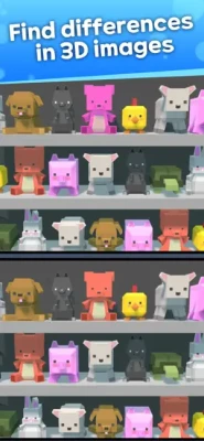 3D Find the Differences is designed to allow you to naturally train your brain through the characteristics of puzzle games. You will need to carefully observe the 3D screen to find hidden differences, which strengthens your cognitive abilities and observation skills. Solving these puzzles helps improve concentration and problem-solving skills while training your brain's visual processing abilities by discovering the subtle differences between two screens. Upgrade your spatial awareness and sharpen your observational skills in daily life with the innovative new 3D Find the Differences game!