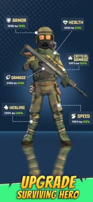 In this zombie shooting game, you can transform your last survivor into an invincible monster killer with a wide range of upgrades. The hero's upgrades directly affect how fast he can run and how accurately he can gun down zombies. Don't forget to upgrade the hero’s equipment and auto-guns, which are crucial in our apocalyptic 3D shooter game. A huge arsenal of auto-guns for every taste and power will be available to you. Upgrading and combining roguelike skills will grant the last survivor unlimited power, enabling him to mow down waves of zombies by the hundreds.