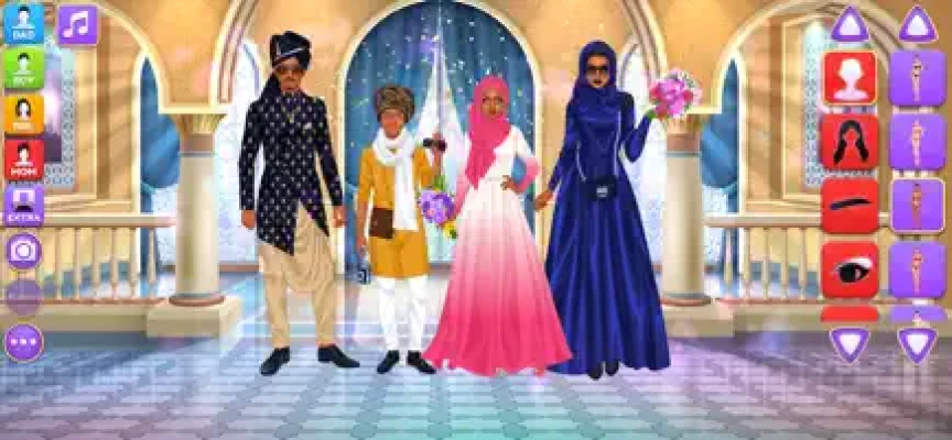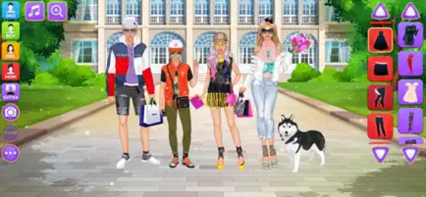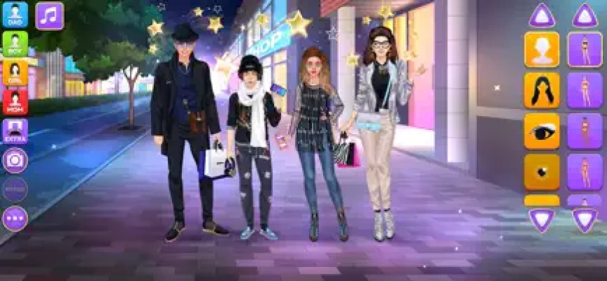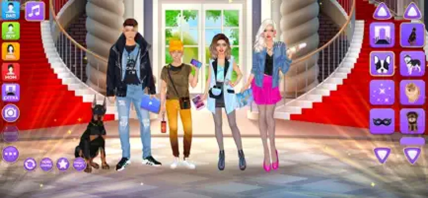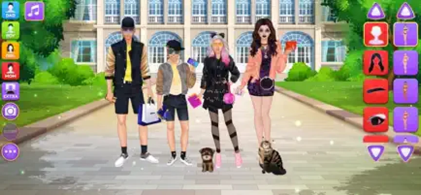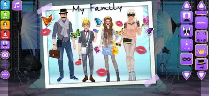 Design luxury outfits and amazing looks for a superstar family of 4 gorgeous virtual models on the same screen! Each character have their own wardrobe with 200+ items of apparel, makeup and accessories. Add cute pets, fireworks and various cool stickers to get the final picture ready for a photo album. Grab a screenshot by pressing the "Camera" button inside the game and share the picture with your friends and family online to show off your fashionista talents.