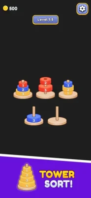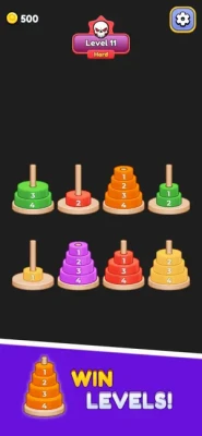 Hanoi Tower Color Sort puzzle game for challenging your brain! [How to Play] - Lightly touch a disc to move it to another rod. - Only the top disc can be moved. - A disc can only be moved if it matches the color of the top disc. - A disc can be moved if it is larger than the top disc it is moving onto. - A disc can be moved if there is enough space on the rod. - Any size disc can be moved to an empty rod. - Success is stacking all the towers from the largest disc at the bottom to the smallest disc at the top in order.