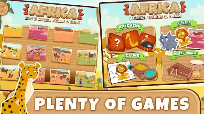 - Four games: Coloring, Matching Game, Stickers and Music for Kids -