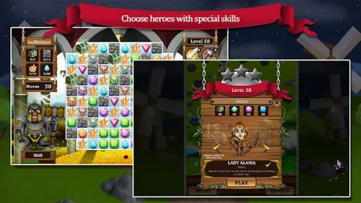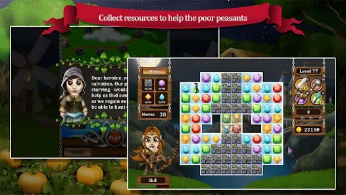 Help the poor peasants who had their homes destroyed. Match your way through this incredible journey, meet great heroes and use their skills to help you and save the day in Age of Heroes: The Beginning!