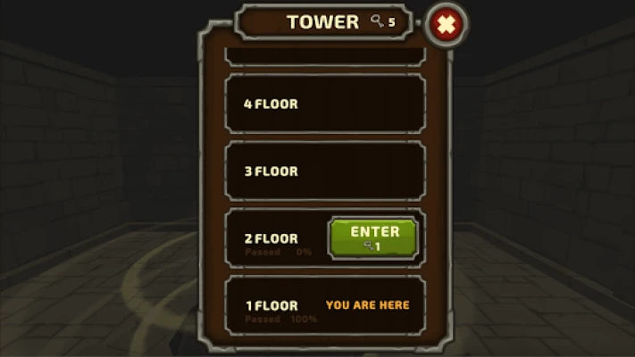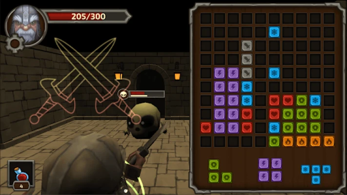 - While exploring the tower you may encounter enemies. To defeat them, collect any 10 runes in a row (vertically or horizontally). After collection, the row disappears, and the hero performs some action depending on what runes were in the collected row: uses magic, hits with a sword, or is healed.