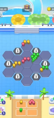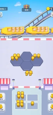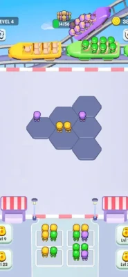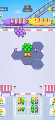 Clear the Grid: Group seven matching-color visitors on a single grid tile to clear them, sending them onto the park ride carriages.