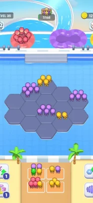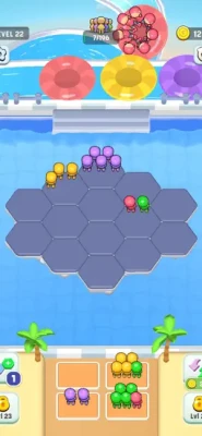 Placement: Drag and drop amusement park visitors onto a grid, where adjacent matching-color visitors automatically group together.