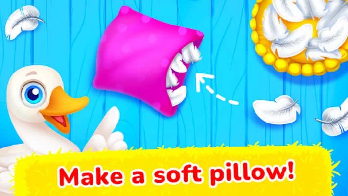 🦆 Ducks and Cushions – Become a pillow-making master! First, fill the cushion with soft feathers, then put on the cover to create a cozy item. Educational games for children.