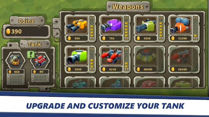 Collect coins to upgrade your tank's stats, purchase and improve weapons.