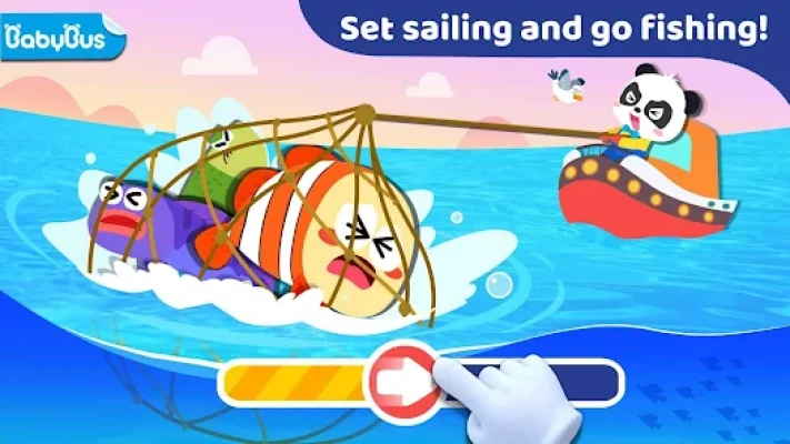Wanna go fishing in a ship? Of course! Trim your nets before you set off, and sew new ones! Remember to bring your binoculars. Let's set sailing! Woo! Find the fish with the binoculars, cast the net, and pull back the net. What will you catch this time? Let's find out!