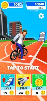 All you need is tap right! Tap to start the crazy ride, tap one more time in front of the ramp to get the acceleration for your bicycle, and continue tapping to use the jetpack while flying.