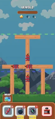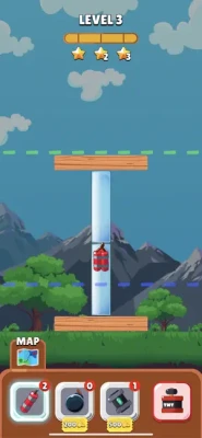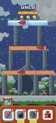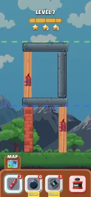 Place the bombs to demolish the buildings. Earn stars to unlock new levels. Various levels with different purchasable bombs.