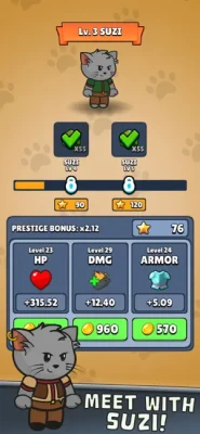 Play as Suzi, the brave cat on a mission to survive challenging levels, defeat powerful bosses, and unlock new stages. Master the art of survival and strategy as you take on tougher enemies. Ready for a fresh start? Prestige to reset your progress, gain incredible power, and keep climbing!