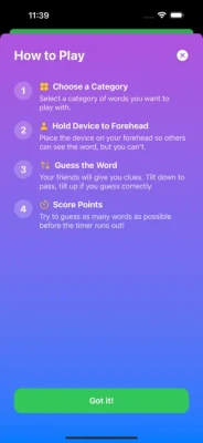 Simply select a category, place your device on your forehead so everyone else can see the screen (but you can't!), and let the fun begin! Your friends give you clues while you try to guess the word. Tilt your device up when you guess correctly or down to pass. Race against the timer to score as many points as possible!