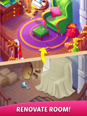 ● Decorate the areas, including the Santa’s room, kitchen, garden, garage, and many other amazing rooms with challenging levels!