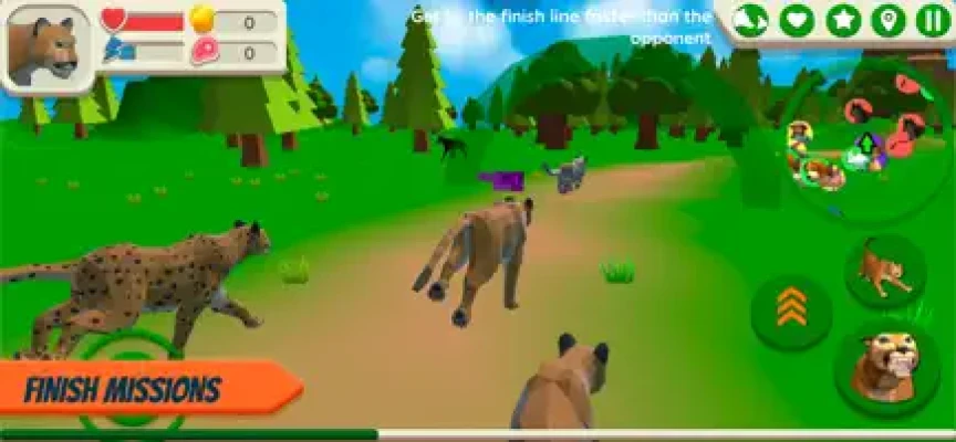 Take part in various tasks! All over the world you can find other big cats that need your help. You can perform various tasks in order to gain experience and coins for improvements. You have to hunt other animals, help to find, collect, plant, deliver, destroy different objects. In addition, some characters hold competitions of big cats! Do you want to know who is faster: a puma or a panther? Or to compete with cheetah, leopard, panther? Then you should try playing Cougar Simulator.