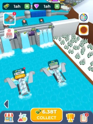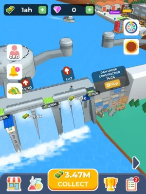 Upgrade each section of the dam individually to increase your earnings. As you progress, unlock a bustling dock in the upstream lake after constructing Dam 2. Once the dock is unlocked, you'll automatically acquire a fishing boat. Send the fishing boat out to the lake, catch fish, and transport them to the dock for additional profits. Use diamonds to unlock new fishing boats and expand your fishing fleet. Dive into the tranquil world of "Dam Builder" and witness your empire grow along with the expanding dam!