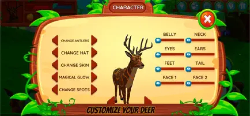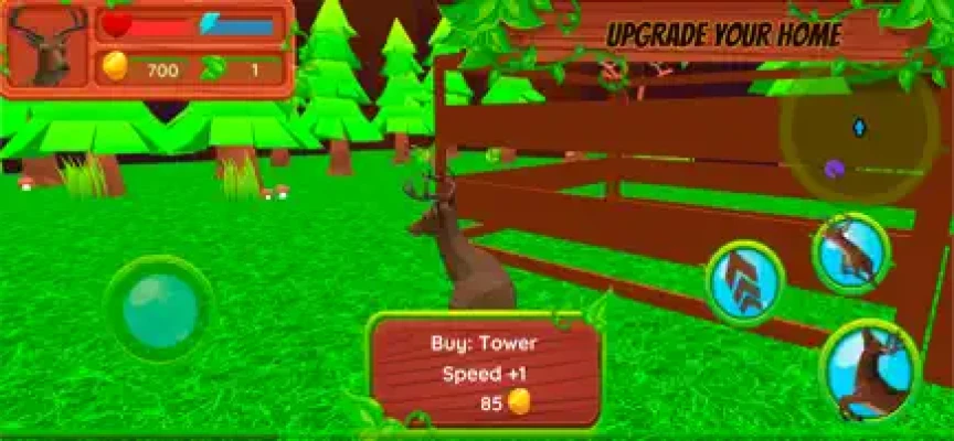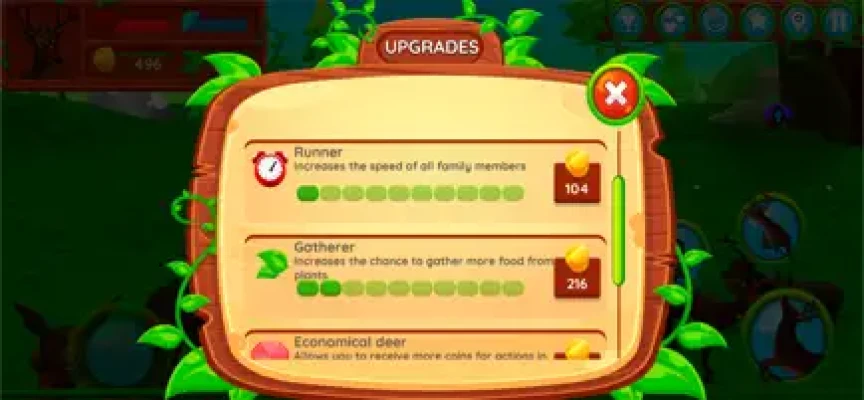 The deer can visit its home. There is an opportunity to improve home by buying various items. Each of the items gives a bonus to the characteristics of the deer.