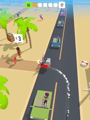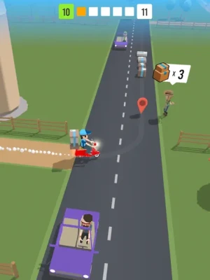 Pick up and drop off packages to customers to earn money and level up. Explore the world and discover new zones.