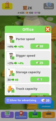 Level-ups for more exciting mining games. Upgrade your equipment, hire skilled workers, and increase your mining speed.