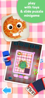 After making your sweet dessert, you can have fun eating it and playing with toys. You can also play a slide puzzle minigame.