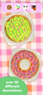 Once the donut is perfectly fried you can decorate it. There are many colorful glazings, toppings, sweets, toys, sprinkles and other decorations to choose from, so your donut will never look the same. For some extra laughs, you can also make them look like funny faces. Making donuts has never been so fun and your creativity is the only limit!