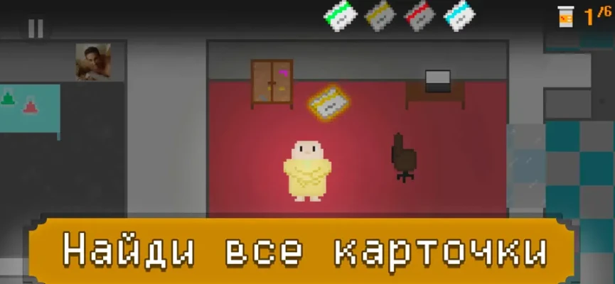 Try to collect all the pills and cards to escape from the madhouse. Escape from Durka offers the opportunity to escape in pixel style. The game may contain: - Incomprehensible and illogical things for you. - Lots of bugs. - A large number of memes. The game does not contain: - Normal optimization. - Good plot. - Beautiful graphics.