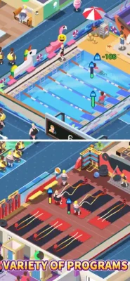 There are treadmills, battle ropes, swimming, calisthenics, boxing and a wealth of other sports, each with a unique and interesting visual animations. Watch the guests working out hard in each gym and feel the fat burning!! You'll even move along with the poses of the customers to the upbeat music!