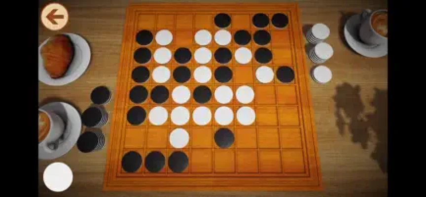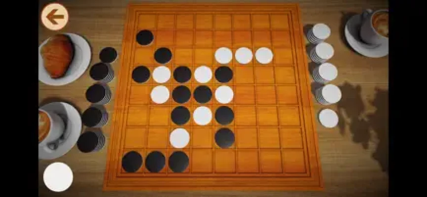 This game uses the same rules as othello and is similar to reversi. Each player takes turns to place down a disc in an empty position, where at least one opponent's disc can be captured and flipped over. An opponent's disc can be captured if it is in between the newly placed disc and another disc of the same color. This can be horizontally, vertically and diagonally. When a player can't make any valid moves, they skip their turn. The winner is the player who has the most discs flipped over to their color, at the end of the game. The circle in the bottom left corner indicates which player is currently making their move.
