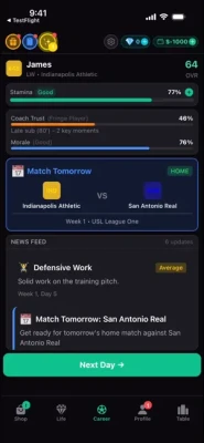 Match Day: Navigate in-match scenarios by making tactical choices (e.g., shoot vs. pass). High match ratings lead to better contract offers.