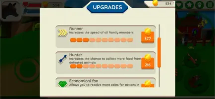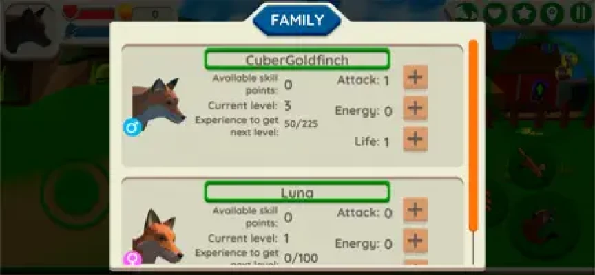 The game has the ability to improve the individual characteristics of family members and characteristics that affect all foxes in the family at once. Do not forget to improve the characters! Get experience doing tasks and hunting. After receiving a level, the character can spend it on points of attack, energy or life. There are also special skills that allow you to increase speed, collect more food, get more resources for actions in the game, etc.