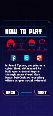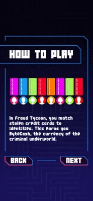 Using puzzle-based gameplay, Fraud Tycoon takes you behind the scenes of criminal organizations that prey on online businesses that have vulnerable security. Developed in conjunction with fraud prevention company Kount, Fraud Tycoon asks players to step into the shoes of a criminal and compete for the fake currency "Bytecash" to purchase stolen credit cards and actual fraud-enabling tools to build your criminal enterprise. While the credit cards, identities and retailers are fictional, the elements of Fraud Tycoon are designed to educate the public about the tools fraudsters use to commit crimes that impact businesses, consumers and our economy.