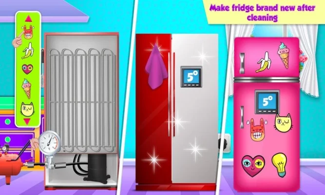 Crazy mechanic! Now it’s to build and fix the interior. First change the broken house fridge’s door with the new one then replace the tray and other damaged stuff in Fridge Fix It Shop. Clean up the fridge from the inside & place stickers to give it a complete makeover in your home spa salon. The fried is fixed and repaired; customer now can put their food, veggies and drinks in the fridge. This crazy game is for little boys & girls fun and learning. It will teach you how to take care of house accessories. Install gas in the compressor to make cooling complete.