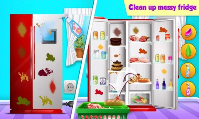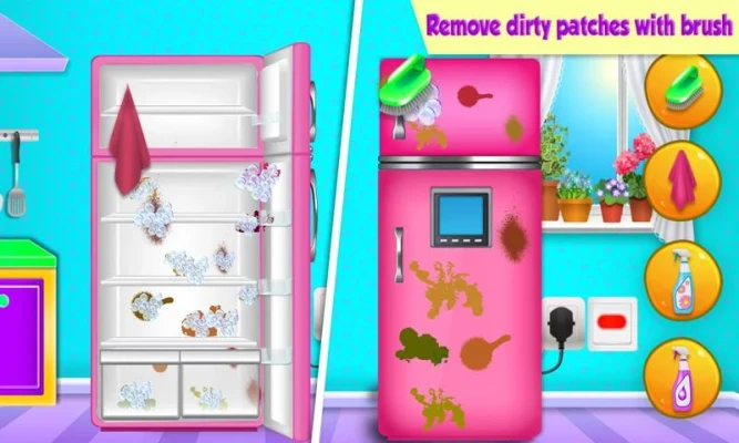 Little man! Come on first you need to select the fridge to fix after cleaning the dirty messy bathroom refrigerator. Fridges are in bad shape, broken parts, damaged body, dirty and messy. Let’s first fix the exterior of the fridge, starts from washing the fridge’s body. Use water to wash the dirt, clean up the sticky spot using sponge and soap, washout the mud and dry water by using the towel like the kitchen princess. Now take out your tools and equipment in Fridge Fix It Shop. The fridge’s body is broken use welding machine to fix it.