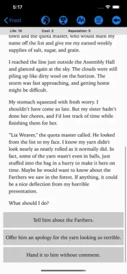 You play Lia Weaver, a young woman orphaned by the Watchers, who is now the head of her family. It's up to Lia to look after her brother and sister, no easy task in the Frost, especially living out in the forest where the Watchers are. If this weren't enough, it's not long before Lia finds herself entangled with a young man from another world. That's when the the real mystery and danger begins!