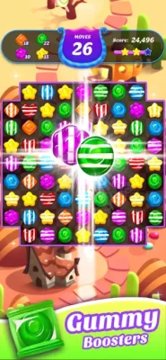 Swap to Match: Swipe gummies to line up three or more of the same color and type.