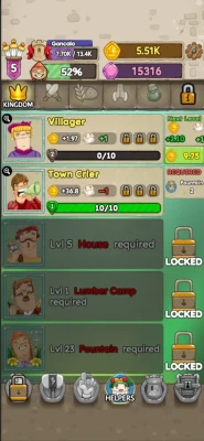 A unique take on the idle clicker genre, this title provides a complete package. Users can grow their kingdom by clicking on different areas and by buying characters. A unique take on the idle clicker genre, this title provides a complete package. Users can grow their kingdom by clicking on different areas of the town, like economy, military, religion and science, to increase the money and the happiness of the people in the kingdom. Players can also purchase different helpers, buildings and other power-ups to make it easier for the village to increase its different aspects.