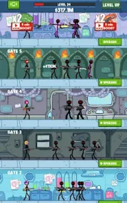 Upgrade Firepower: Spend your earnings to level up your stickmen and increase their damage per second.