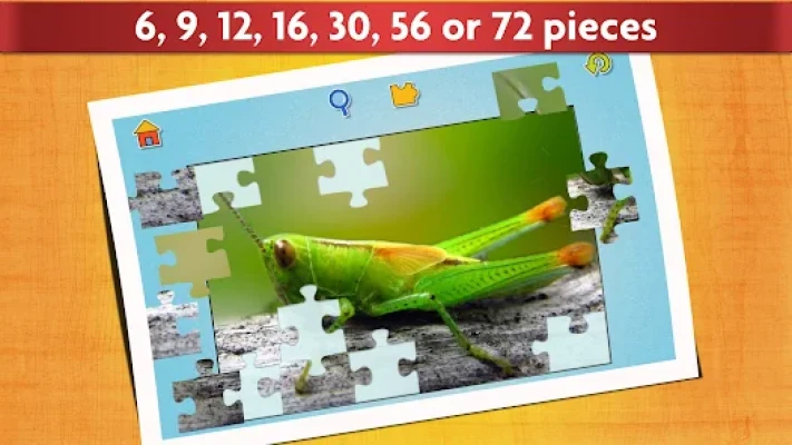 In this offline game with exciting insects you can also choose whether to use 6, 9, 12, 16, 30, 56 or 72 pieces to adjust the difficulty depending on age and skill.
