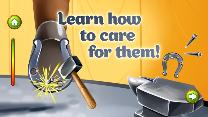 The task is to nourish the horse on the farm with some fresh hay. To heal the horse the kid attaches a horseshoe to the hoof, one by one, with the help of a hammer and nails. Then he should turn up the soil with a plow and take the harvest. Cool animal games, aren’t it?