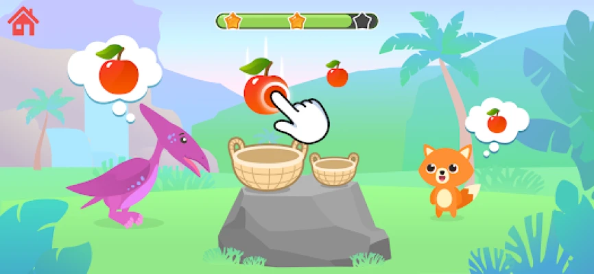 Help dinosaurs sort fruits into baskets. Develop fine motor skills by dragging the pictures of apples, pears and other fruits in the right direction, but remember: only large items fit in a large basket, and only small items in a small one!