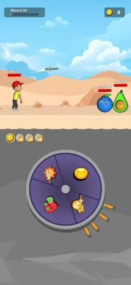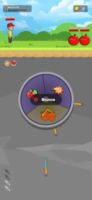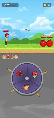 By using simple tapping gestures, you throw knives at moving targets. Each precise hit deals damage to your enemies, but beware, each target has a different value that determines the bonus your hero will apply! Whether it's multiplied damage, a welcome heal, or even a freezing ability, choose your target wisely to maximize your chances of victory! Your hero retrieves previously thrown knives with their associated damages, creating devastating combinations and unique tactical strategies. With special knives and bonuses scattered across the battlefield, you can earn even more points and face your enemies with style! But remember, every knife counts! Skillfully manage your limited number of knives and upgrade them to become even more formidable! As you progress through the various waves of enemies, you'll earn money that allows you to unlock new challenges and customize your hero. Before each battle, after triumphing in the puzzle, you'll have the opportunity to choose from three upgrade proposals to strengthen your skills and dominate every fight! Discover the perfect blend of reflexes, strategy, and fruity fun!