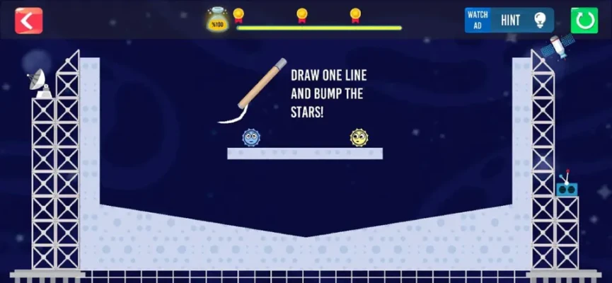 Let's test your logical and flexible thinking, all you need to clear the stage is to draw lines and shapes freely to move and roll the happy stars and bump them into each other.
