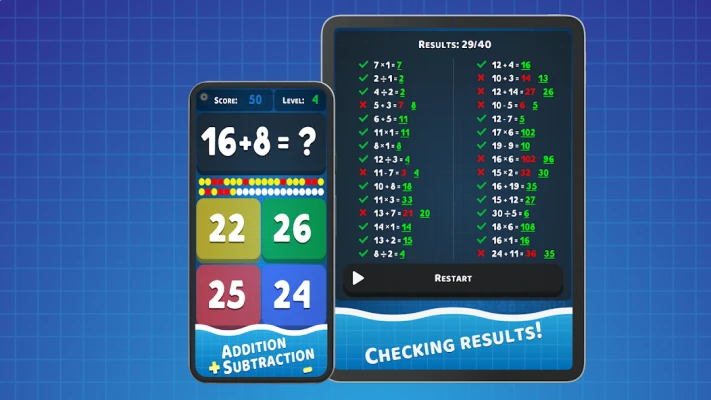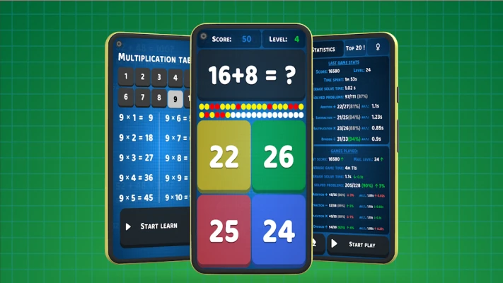 In Game Mode you will have to show all your arithmetic skills and times tables to solve math problems on addition, subtraction, multiplication and division. Any mathematical game trains arithmetic skills. But when the time to solve problems is limited, this skill rises at a higher level. The more math problems you solve, the more difficult are new problems. After every math game you will see detailed statistics table with your math skills data. Or you can compare your results with worldwide math leaders.