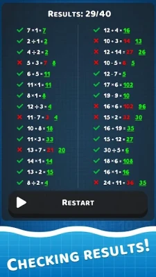 In Learn Math mode you are not limited with time and after session you can check your results in a table.