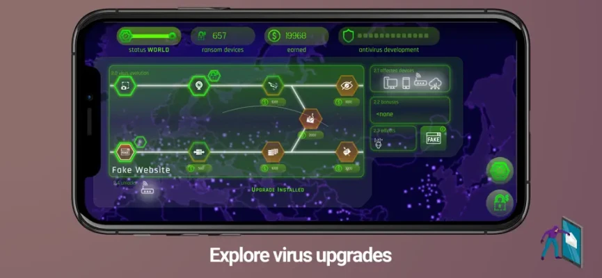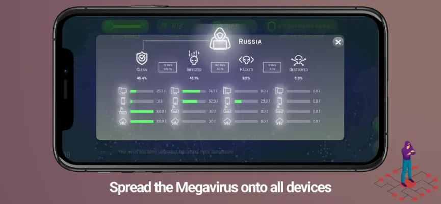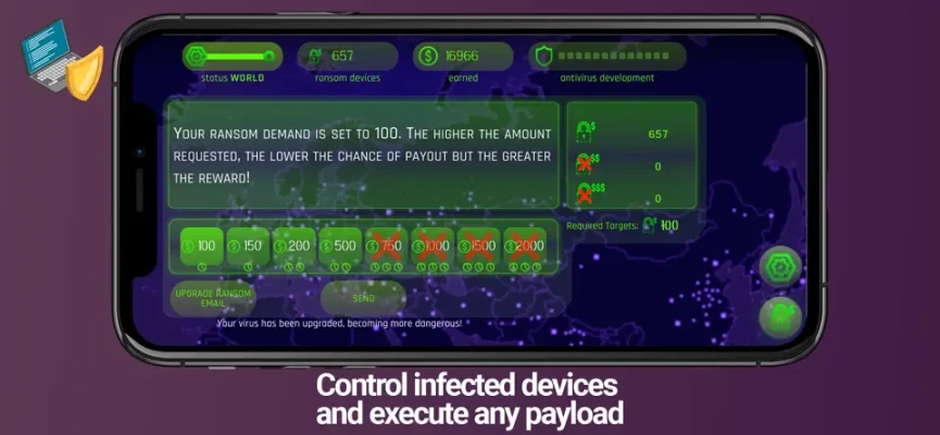 Control infected devices and execute any payload! Make them pay ransom or use their device to mine cryptocurrency to gain more resources and evolve your Megavirus even further.