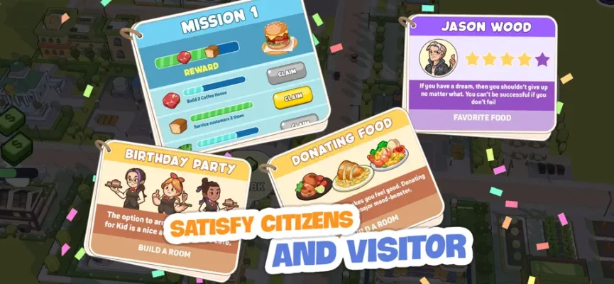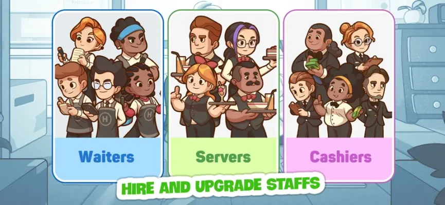 - Hire, train, and upgrade chefs and waiters to maximize your profit.