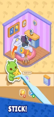 Decorate: Select your unlocked stickers and place them on furniture, walls, and floors to complete your design.