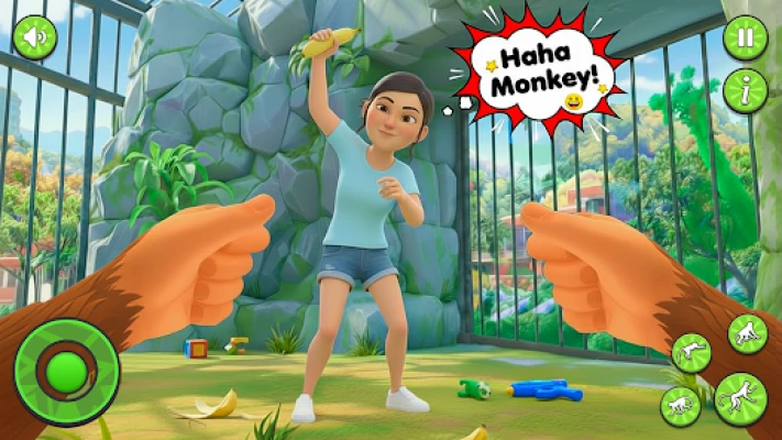 Explore big interactive open world city zoo maps filled with fun and surprises. Run through large zoo areas, sneak into restricted zones, escape from cages, climb rooftops, and discover secret passages and escape routes in the naughty monkey game. Explore jungle zones, city areas, and hidden paths that make every level exciting and unpredictable. Become the ultimate naughty monkey game prank master by using silly tricks and crazy items. Throw bananas, eggs, coconuts, and water balloons to prank zoo visitors and staff. Tease humans, scare them, confuse them, and enjoy their funny reactions in the naughty monkey zoo prank game. Escape angry guards using trees, ropes, cages, and rooftops. Every monkey prank creates laughter, chaos, and unforgettable monkey zoo prankster moments.