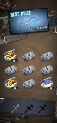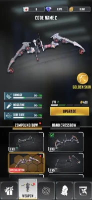 Weapons are divided into two main types, bow and crossbow, each with 17 different models at present, varying in performance and tactical role. Complete a set number of stages to unlock new gear, and upgrade to raise damage, arrow count and rate of fire, strengthening your combat power and forging your own exclusive arsenal.