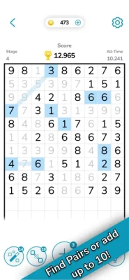 * Match the numbers on the game board that are the same (6 and 6, 8 and 8) or add up to 10 (7 and 3, 9 and 1). Tap on these numbers to connect them and remove them from the board.